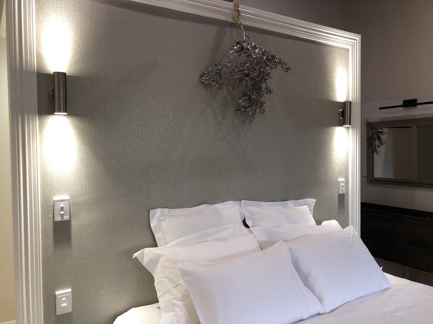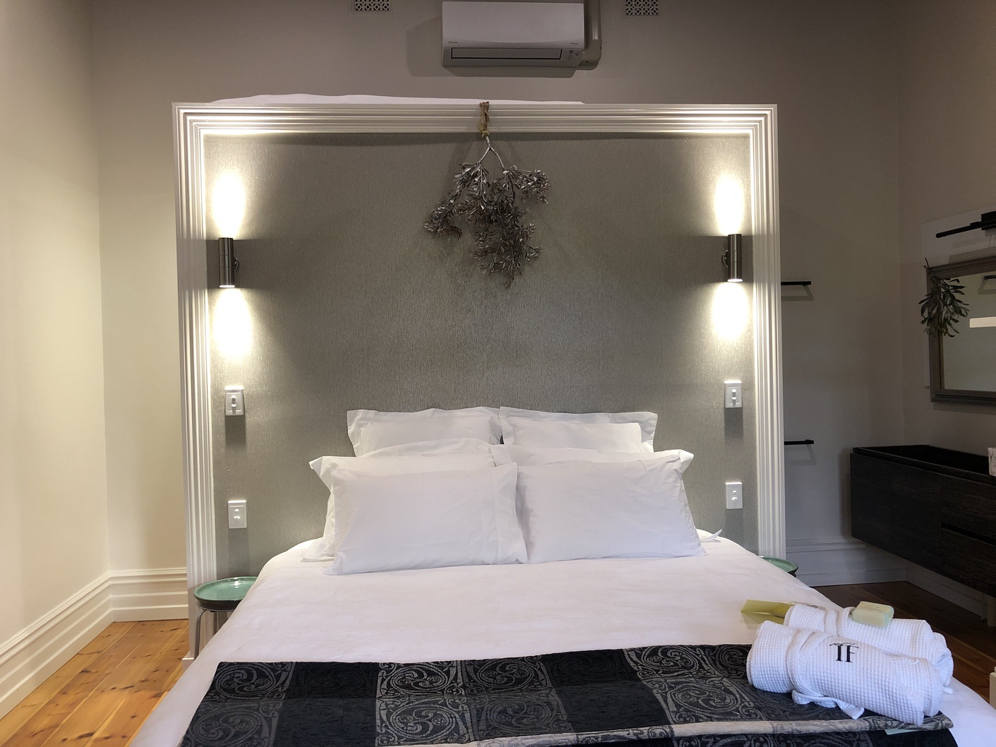 . . . facing the eastern veranda of The Farmhouse the Ivy Room, with Baltic pine floors, high ceilings, heating & cooling system, ceiling fans, ensuite bathroom & wall mounted TV has a King size bed, luxurious linens and an elegant feel – it’s just delicious!
